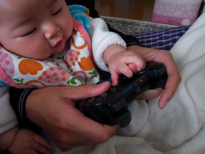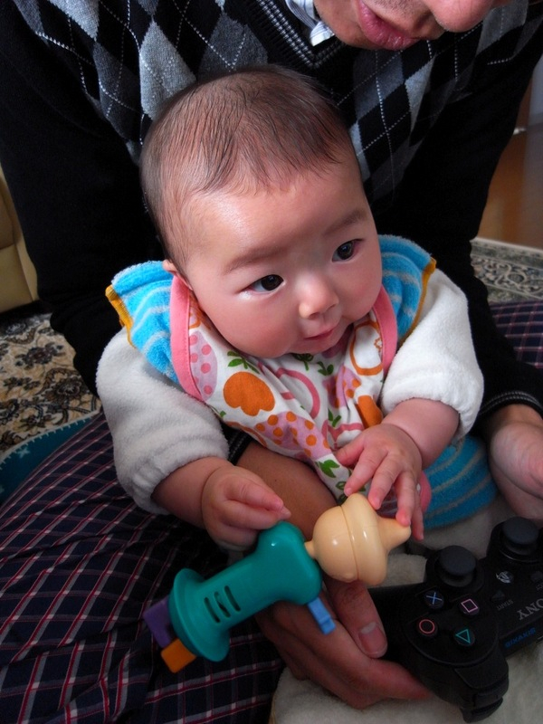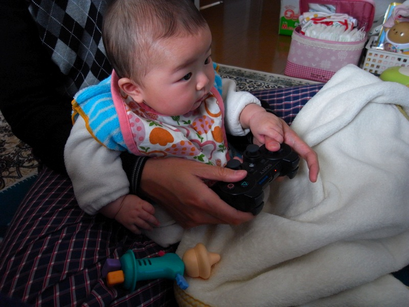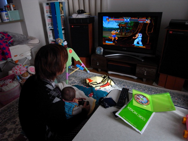 ますは午前中、パパのお膝に座って餓狼伝説2を見物。。。![]()