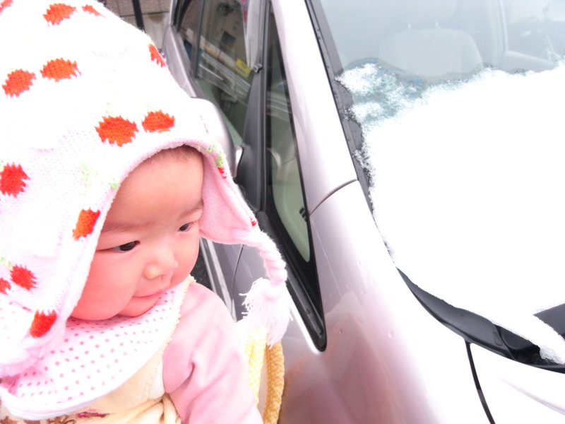 今日は昨夜から降った雪を見ようと外に出たら。。。もう雨で溶けてしまっていましたと言う事で雪とパチリ産まれて初めて見る雪です