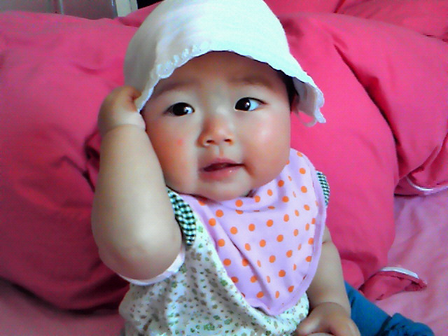(下着が見えちゃってますが…coldsweats01)退院の日にかぶっていたベビー帽を久しぶりにかぶってみました