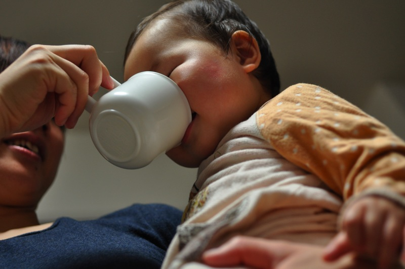 夜寝る前にママが水をコップで飲んでいたら、飲みたそうだったので飲ませてみました