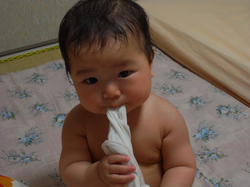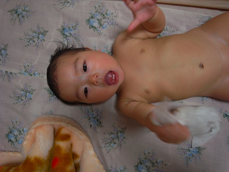 お風呂に入った後、すぐに服を着せると嫌がって泣くのでいつも、しばしの間放置されている凛ちゃん![]()