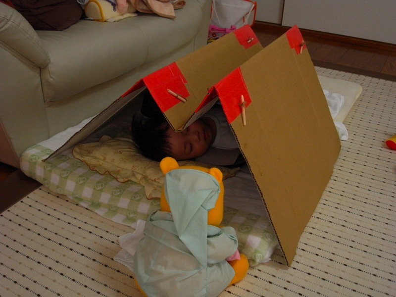 リックンの上に掛けられている物はパパお手製の光避けだそう