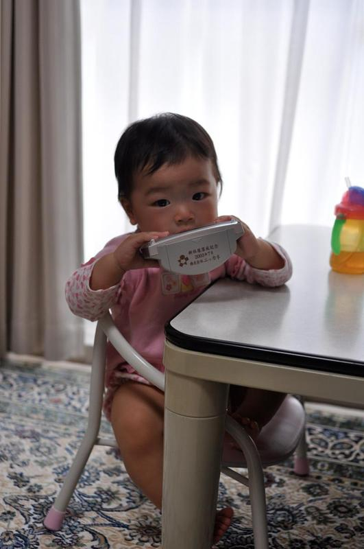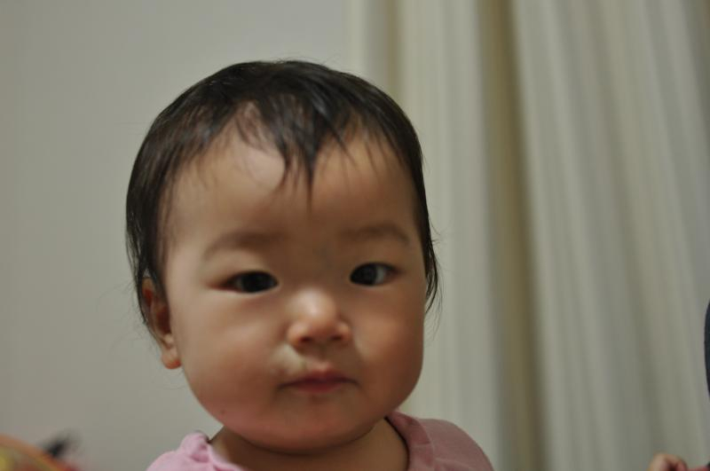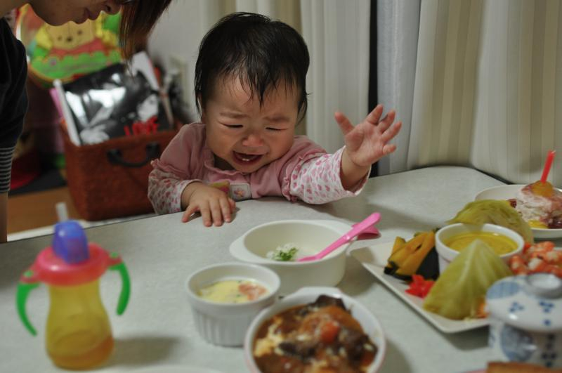 まだママがいろいろ準備中だったので、パパに手を出すのを止められてビーーと文句をいってる主役![]()