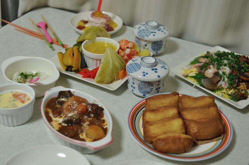 いなり寿司、うなぎと海鮮ちらし寿司、茶碗蒸し、牛すね肉のワイン煮込み、バーニャカウダ、凛ちゃん用ケーキも奥にあります。豪華です![]()