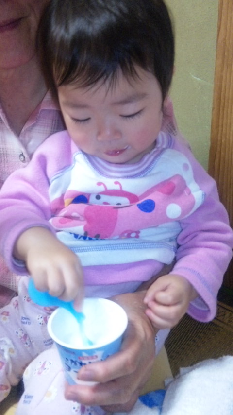 食欲は普段よりない気がしますが、じぃじが買ってきたヨーグルトが美味しかったらしく食べてました![]()