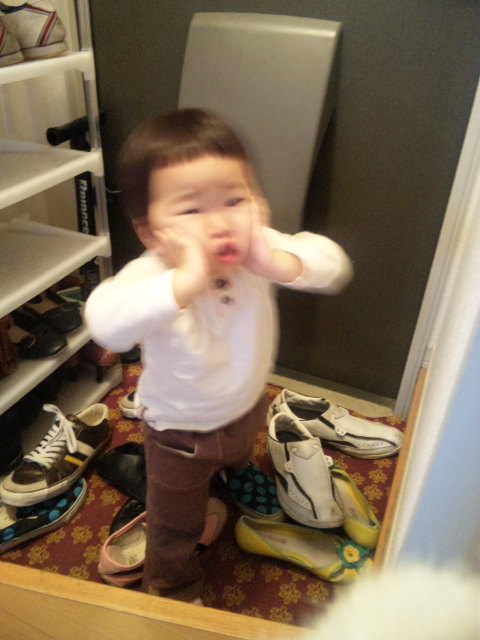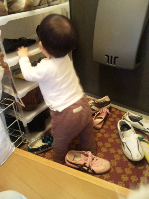 パパとママの靴を散らかして、しかも履いたりして遊んでます