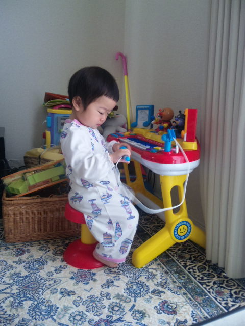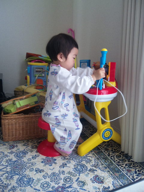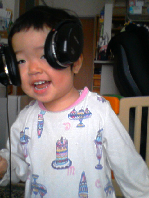 そして、パパのイヤフォンをゲットして、朝っぱらからDJ気取り