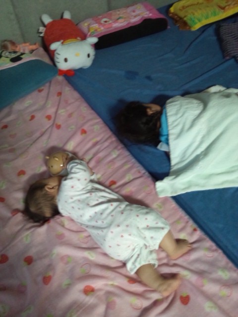 幼稚園から帰ったら、お昼寝しちゃったお姉ちゃんと玩具で遊ぶ美音さん。。。お姉さんはこの後、起きてお風呂に入りました。。。