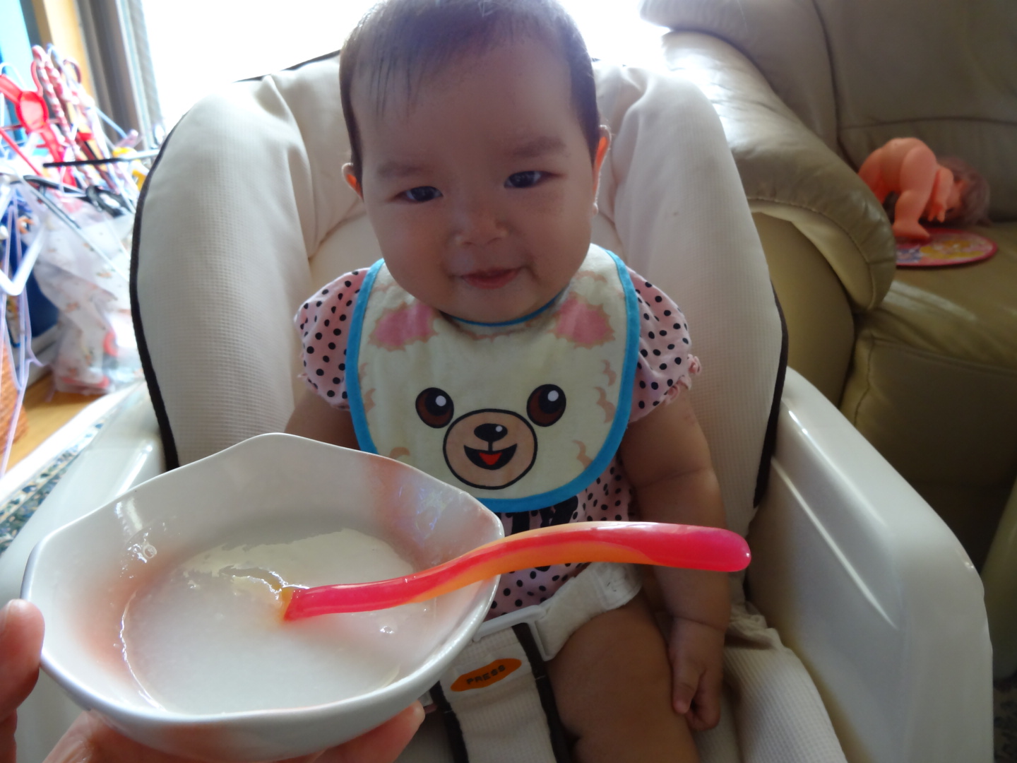 今日も下痢が落ち着いている感じなので、久しぶりに離乳食confident 久々なので、潰したおかゆですconfident