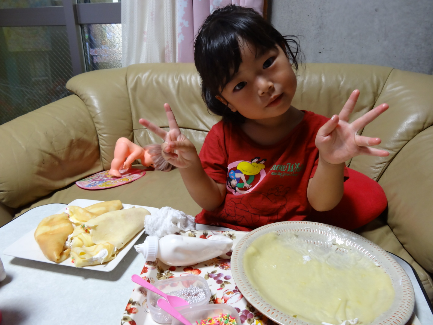 この後は、ものすごい雷雨でしたrainthunder 美音ちゃんも連れて行ったので、降られる前に帰れたので良かったです。。。今日のおやつはクレープnote メルちゃん。。。↓