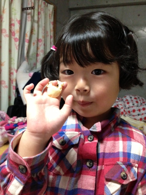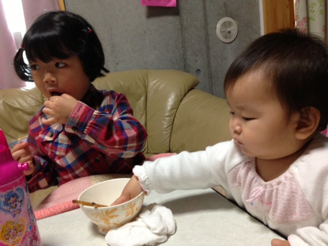 おやつの時間・・・美音ちゃんはねぇねぇが食べているトッポが気になるようです。。。