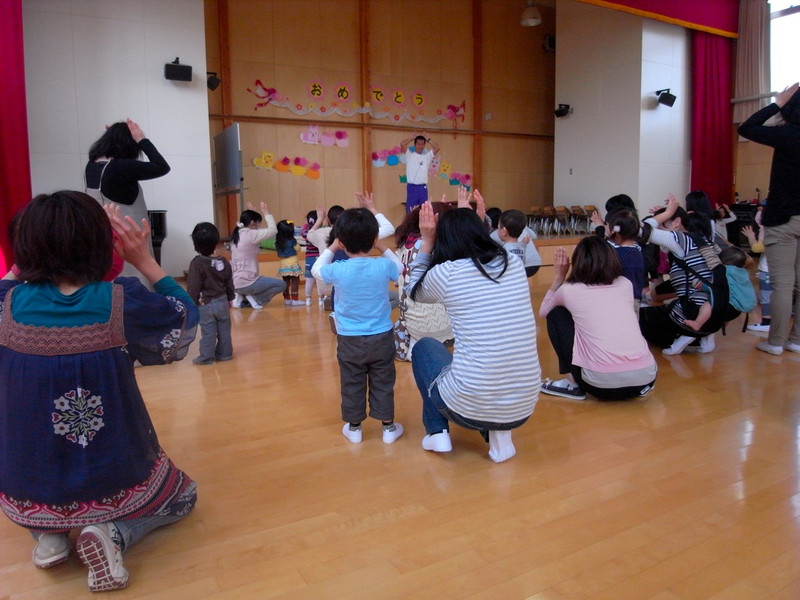 今日は園長先生のお話を聞いてから、体操の先生(軽、くぐっさん似)と一緒に体操をします