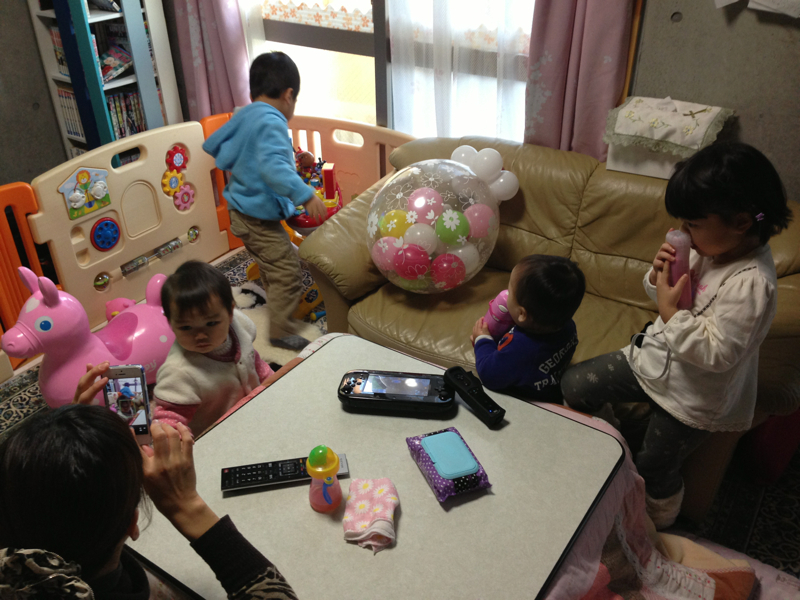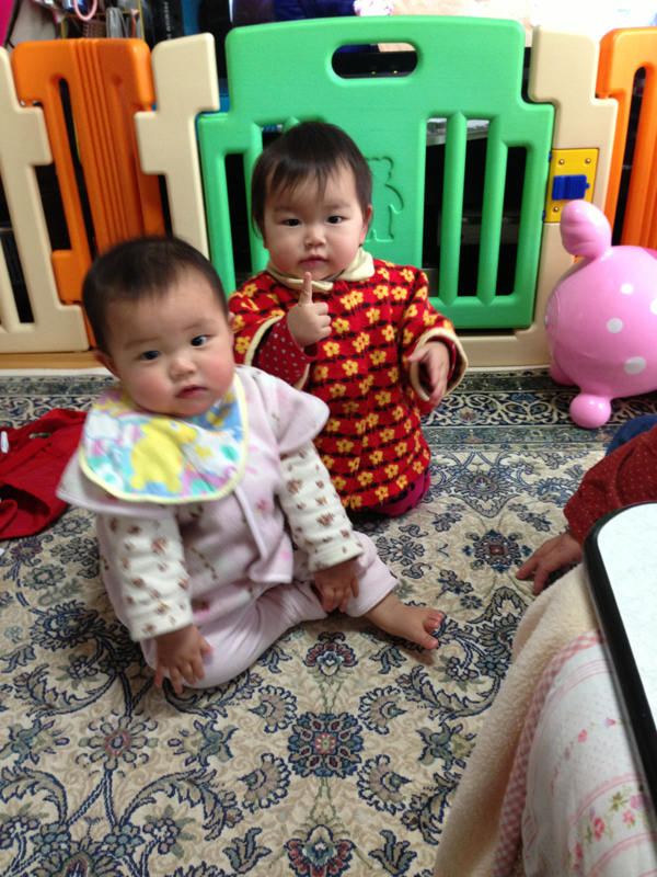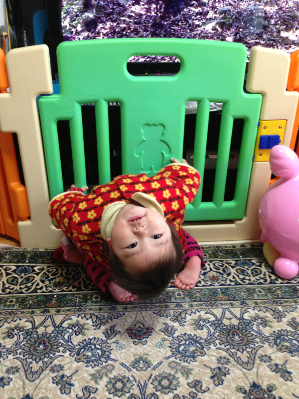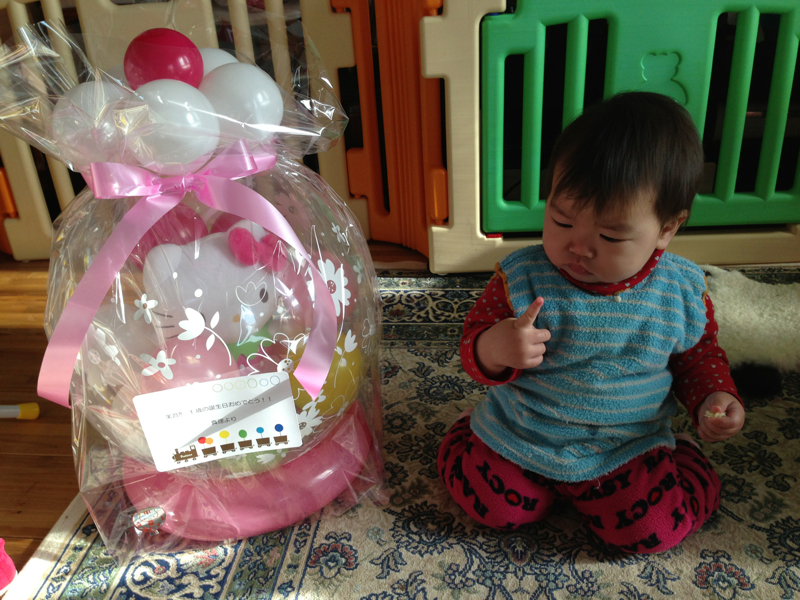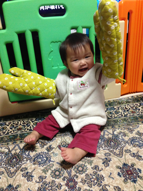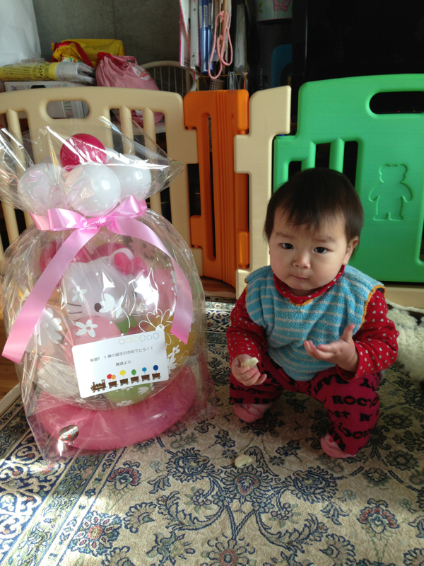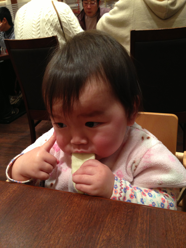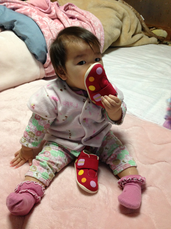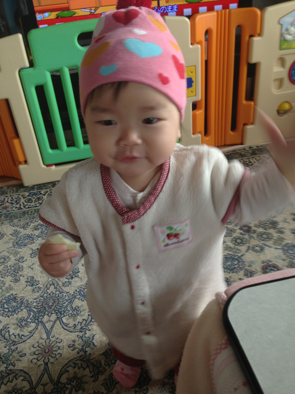 最初寝ていた、美音さん、、、起きてしまい降りる〜と言うので座らせてみました。大好きな赤ちゃんおせんべいは、近くのまちおかでパパが購入してきてくれました