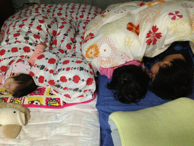 今朝のお布団風景。。。凛ちゃんとパパがすご~く近い(笑)ラブラブですね〜![]()