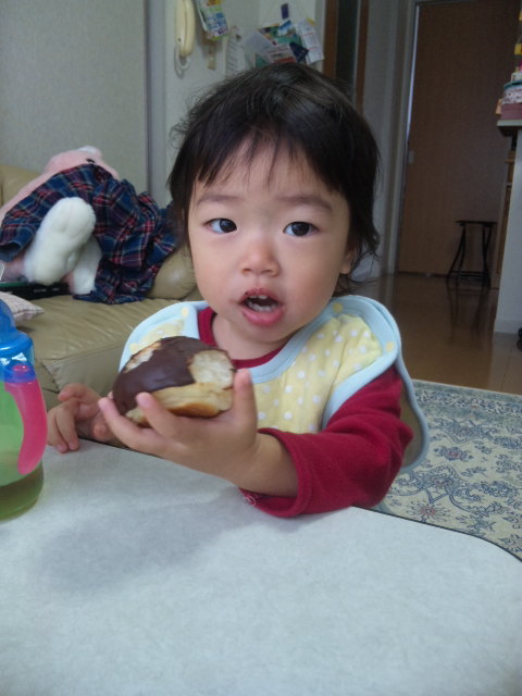今朝は『まっくろくろすけ』のパンを食べて「おいしぃ〜」と一言![]()