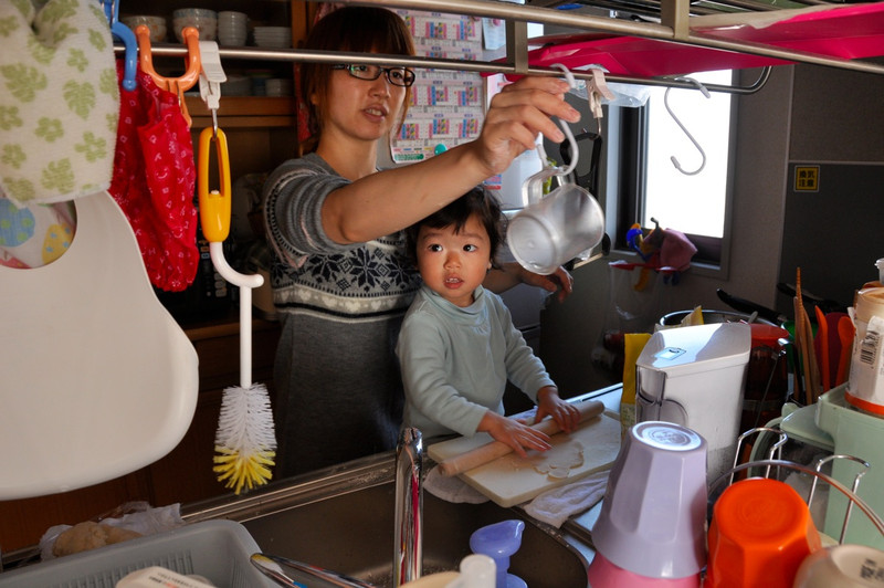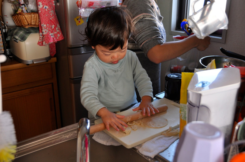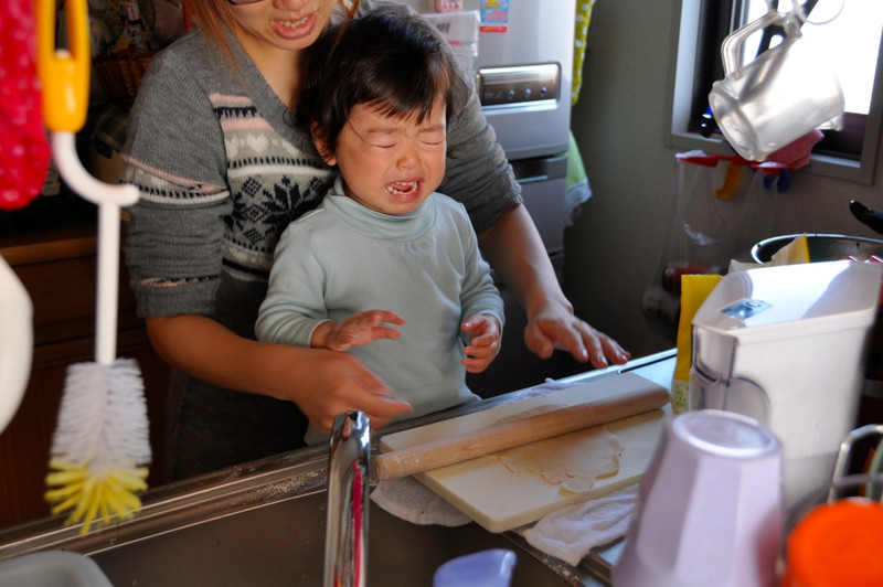 凛ちゃんも一緒にコネコネ・・・・が次の瞬間、ママが凛ちゃんの指まで麺棒と一緒に転がしてしまい、大泣き・・・